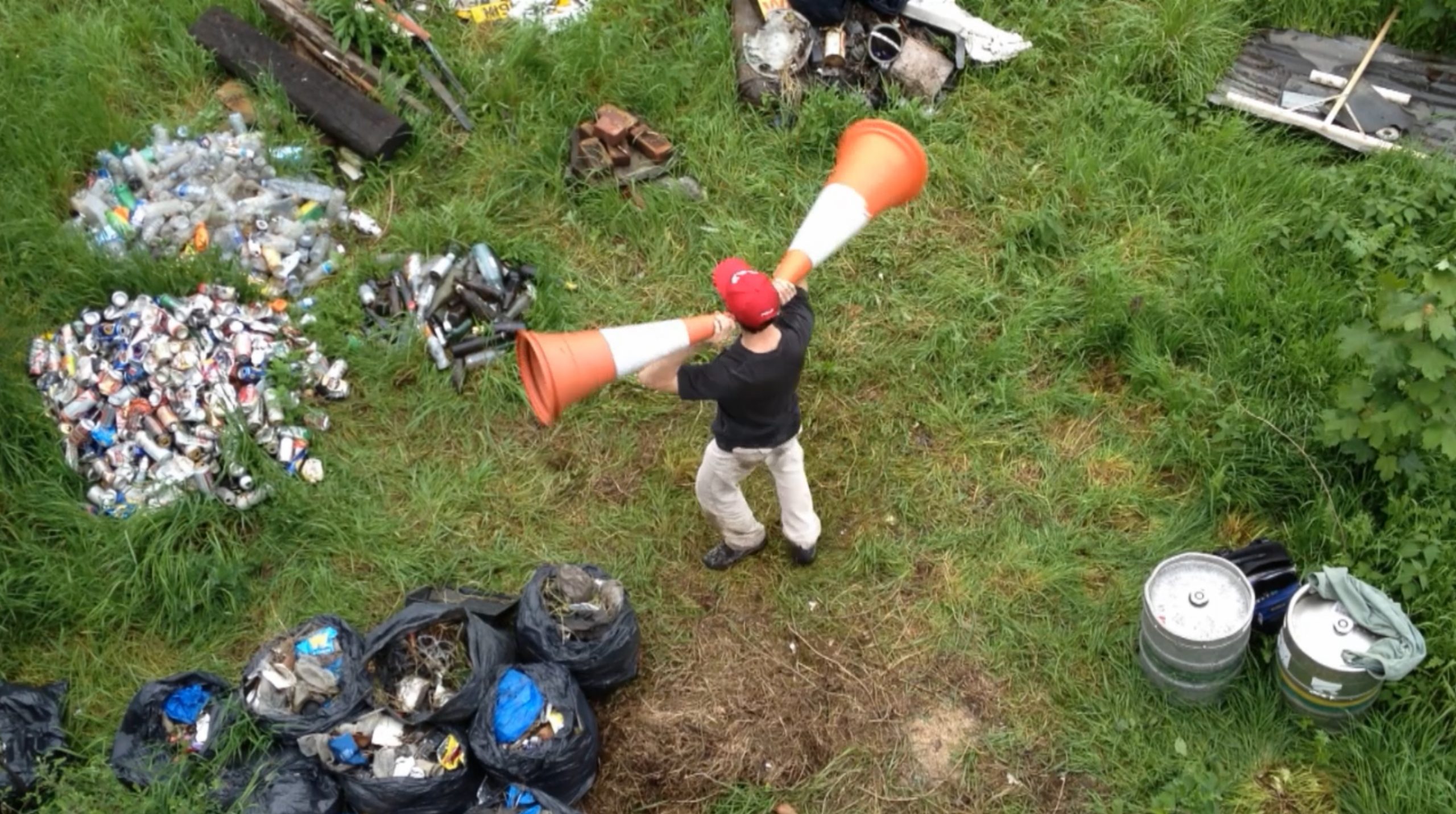 (Best listened to with headphones) Working in an abandoned parcel of land in Hackney Wick, East London, these two hazard cones were found among other trash. They amplified the sounds from the highway (East Cross Route – A12) and the feeling of running in circles trying to keep on top of the trash – April 2012.