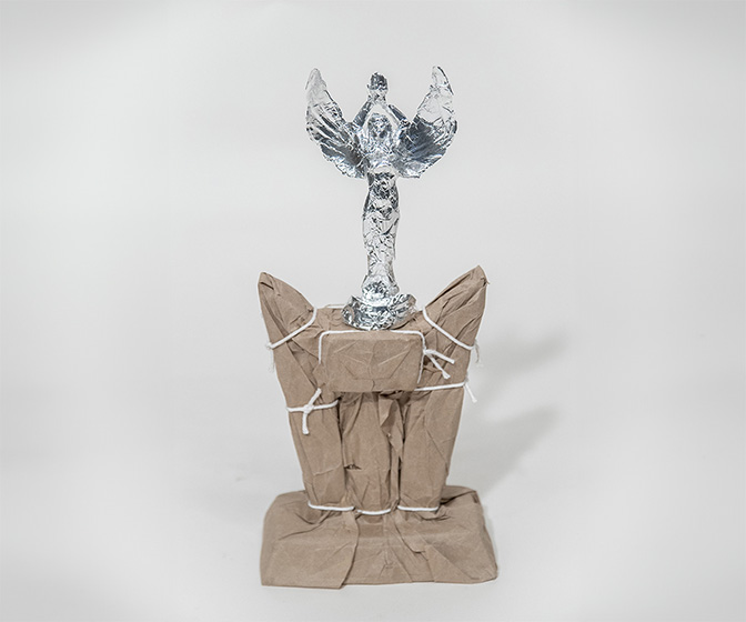 S’intéressant aux marges, l’installation de trophées au niveau supérieur de la cage d’escalier en béton de la Maison de la culture Maire-Uguay, reconnaît les choses et les actes qui passent souvent inaperçus. La cage d’escalier fonctionnelle et pratique est transformée en salle des trophées. Chaque trophée attire l’attention sur des actes et des attributs non célébrés qui sont des constantes dans la vie – passer l’aspirateur, faire les vaisselles, la couleur brune, des repères revisités du temps passé – les repères provenant des ombres