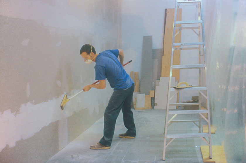 Un mur a été construit dans la galerie, divisant ainsi l’espace en deux pour la durée d’exposition. Les éléments utilisés durant la construction ont été laissés dans l’espace : feuilles de contreplaqué et de gyproc. L’eau d’une fuite était collectée dans un seau. Un établi avec porte-outils intégré faisait dos à une réplique de salle de bain munie d’une pharmacie et d’un robinet fuyant. Deux éléments représentant le passage du temps y figuraient aussi : un balancier suspendu du plafond et un petit moniteur vidéo installé sous l’établi montrant le mécanisme d’une horloge en mouvement.