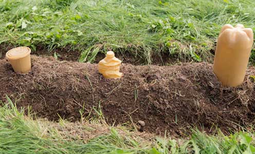 Sowing Rubbish is the combination of the representation of industrial processes of casting and agriculture, both processes that have the production of multiples as an end result. The project was part beeswax casting of rubbish and part sowing of the cast rubbish replicas in 50′ long furrows cut into the ground. The furrows extended from the centrally located casting station in four curved lines creating an effect of movement, spiraling out from the center.