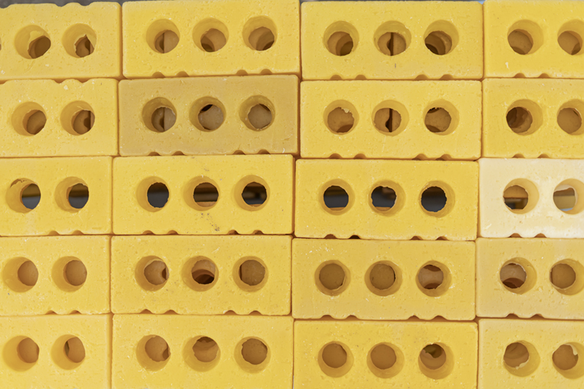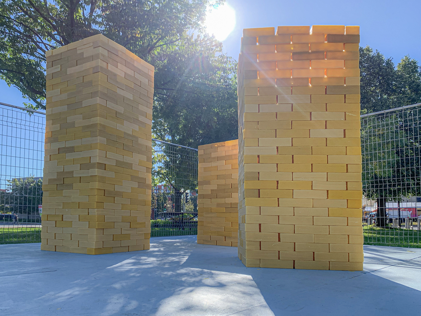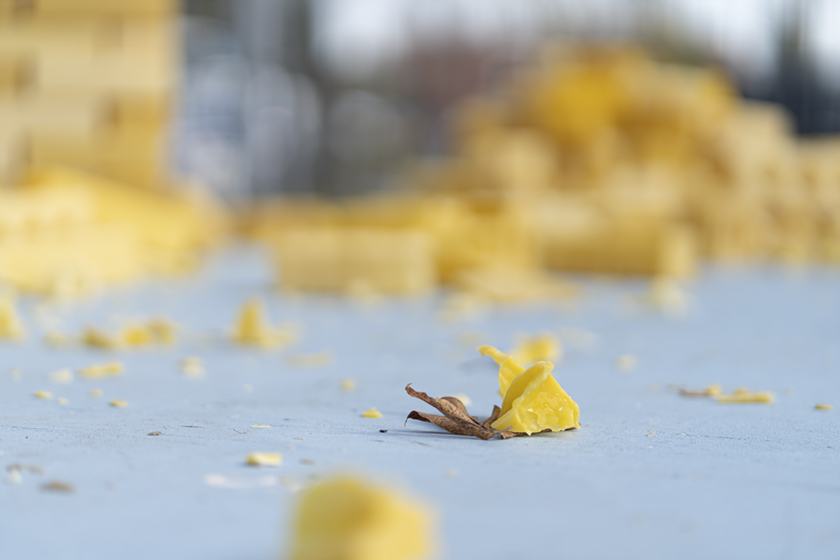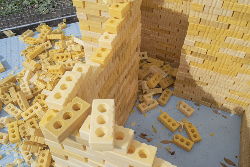 (This is) What happens when a thing is maintained (?), part IV, is an alternative to the conventional idea of public art as stayed, static, non-changing. Instead the focus is on temporality, ephemerality and change as aesthetic qualities that also define sculpture. With its three towers of hollow cast beeswax bricks, the piece is susceptible to deterioration which allows for the performance of some maintenance. The bricks that form the towers are casts of clay bricks, a ubiquitous component for building structures in which society lives and works. Beeswax provides a reference to the foundational material that support the work and social hierarchies of the honeybee community. With the malleability to take on desired shapes, the hollow beeswax bricks form the towers with limited strength. Exposure to the elements (natural and human), reveal in a short period of time the cyclical nature of building, deterioration and maintenance, and the attention required to restore and revalue the original.