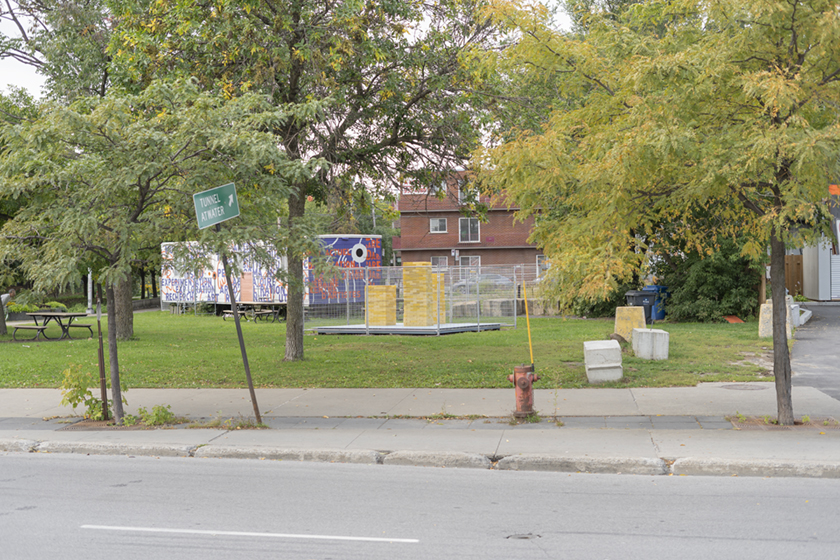 (This is) What happens when a thing is maintained (?), initiated in 2004 and installed in Viger Square (Montreal), was the inaugural exhibition within the experimental framework of Dis/location, a project in which DARE-DARE moved from the white cube to a mobile office entrenched in the urban environment, a project that continues beyond these days in 2020. The current manifestation is thanks to the City of Montreal and the Voies actives et sécuritaires – Œuvres et installations artistiques, a project that provides for previously exhibited sculptural works to be installed throughout the city along the routes designated as safe passage for pedestrian traffic during the time of the pandemic of 2020. DARE-DARE has graciously provided administrative support and the site near Atwater Market, a Dis/location for the mobile office since 2015, a fitting collaboration for the re-presentation of this work.