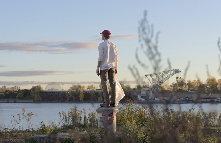 The Wanderer: (re)Marking considers the Lachine Canal as an entity, seen through the eyes and actions of The Wanderer, a character created by the artist Douglas Scholes. Scholes embodies the Wanderer while performing a series of walks and interventions within the Lachine Canal National Historic Site. These acts respond to the environment, the history and the current and imagined realities of the canal. The Wanderer walks, picking up rubbish as a routine maintenance activity, drawing attention to objects and places on the Canal including bollards, water, structural vestiges, train tracks, and construction sites, revealing the hidden changes.